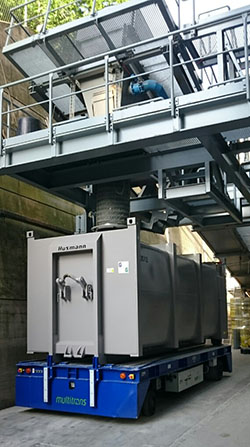 One example of this is the scenario described at the beginning of this article. First, a truck places an empty roll container on the platform trailer. Then an employee positions the trailer by remote control under a downpipe, where the container receives the slag produced by combustion during the next 24 hours. Once the previously set maximum filling weight is reached, the weighing indicator sends a signal to the conveyor belt and filling stops automatically. An employee is now needed for the first time to guide the weighing platform trailer reliably up to a roll-off tipper, using just a small amount of space. The trailer then automatically receives the roll container from the electric vehicle without the use of any external machines.