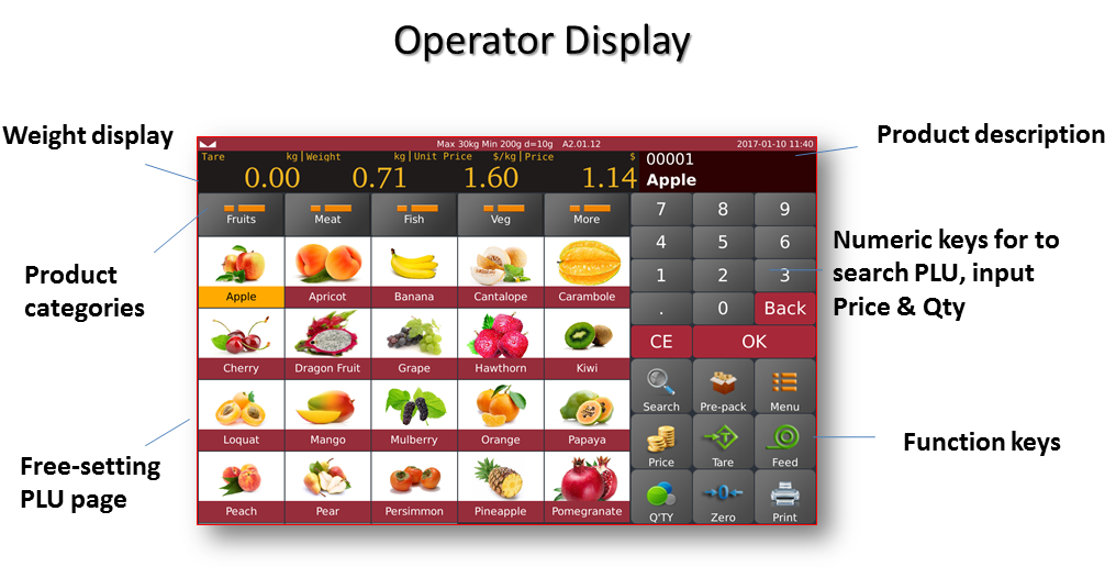 User friendly Resistive Touch Operating display, 18.5” HD Touch Self-service Operational display with the resolution 1366x768. Self Service Operation, Self service scale allowing for to operating the customer without any help of the operator, display and audio messages will guide to choose the right item for to get the label. It’s reducing labor cost and giving high end shopping experience.