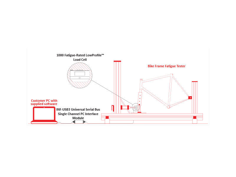 Fatigue testing is critical for bike design engineers. Our customer wanted to perform a fatigue test on their bike frames and analyze the strength of their bike frames in order to ensure durability and high-quality standards, turned to Interface for a solution. We suggested installing Model 1000 Fatigue-Rated LowProfile™ Load Cell to the customer’s bike frame fatigue tester. This load cell provides the customer with highly accurate results through the fatigue cycling. These results are collected using the INF-USB3 Universal Serial Bus Single Channel PC Interface Module and displayed on the customer’s PC or Laptop with Interface’s provided software. With this solution, the bike manufacturing company successfully had their bikes undergo fatigue frame testing, receiving highly accurate results with Interface’s load cell and instrumentation.