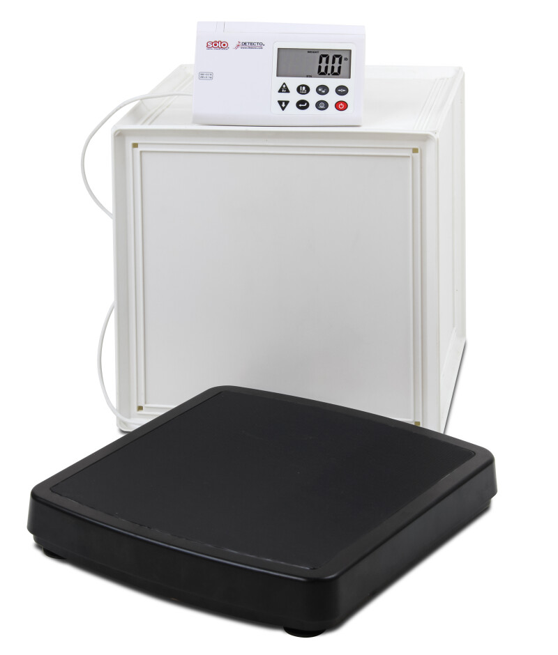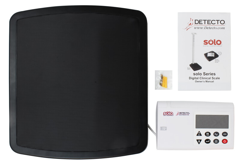 Detecto Scale (United States) - Press Relase: DETECTO’s New SOLO-RI low-profile, portable clinical scale has a 7.25 ft / 2.2 m cable to the remote display, so you may position the indicator wherever it’s easiest to view. The space-saving compact design allows for flexible patient weighing use. The bracket included with the display allows it to be mounted on a wall or set on a countertop for convenient viewing. The SOLO-RI features 550 lb x 0.2 lb / 250 kg x 0.1 kg capacity, 6 AA batteries (included), Body Mass Index, Mother/Baby mode for factoring the weight of infants and toddlers held by an adult, audible beep confirmations, large 1-in/25-mm high LCD digits, and the 14 x 15 inch platform with ribbed rubber mat is only 2.4 inches high making it easy for patients to step on/off.