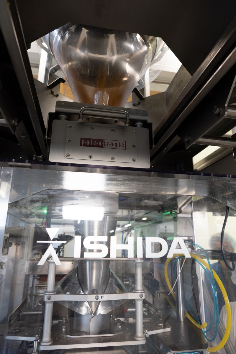 Funnels guide the snacks to the gantry-mounted Ishida CCW-RV multihead weigher. Loadcells underneath the multihead’s dispersion tables allow for a consistent product flow to the radial feeder troughs. The vibrating troughs transfer the product to a set of 14 pool hoppers, which hold them for a short time before supplying them to another row of 14 weigh hoppers. As soon as a weigh hopper becomes empty and is available for its next filling process, a signal is sent to the corresponding pool hopper.