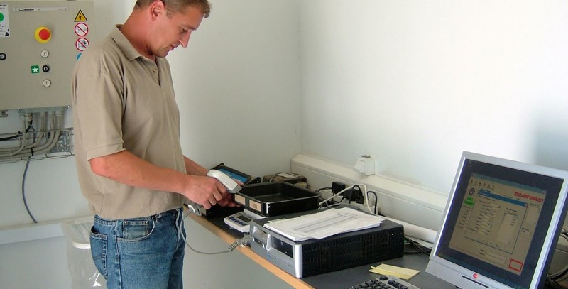 But, before the driver leaves the plant, he must hand over a sample of the woodchips for analysis and calculation of the caloric value in a locked room. The drivers opens the door with his magnetic card in a Scanvaegt terminal, controlling access to the room. Inside the driver places the sample in a tray with an individual number (ID-no. in barcode). The tray is placec on a laboratory scale and weighed. Now the driver then scans the tray number and his weight slip, and then data about weight, tray number and expedition no. is coupled together and stored in the control system.
