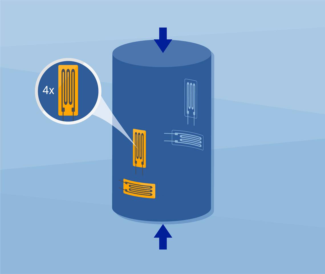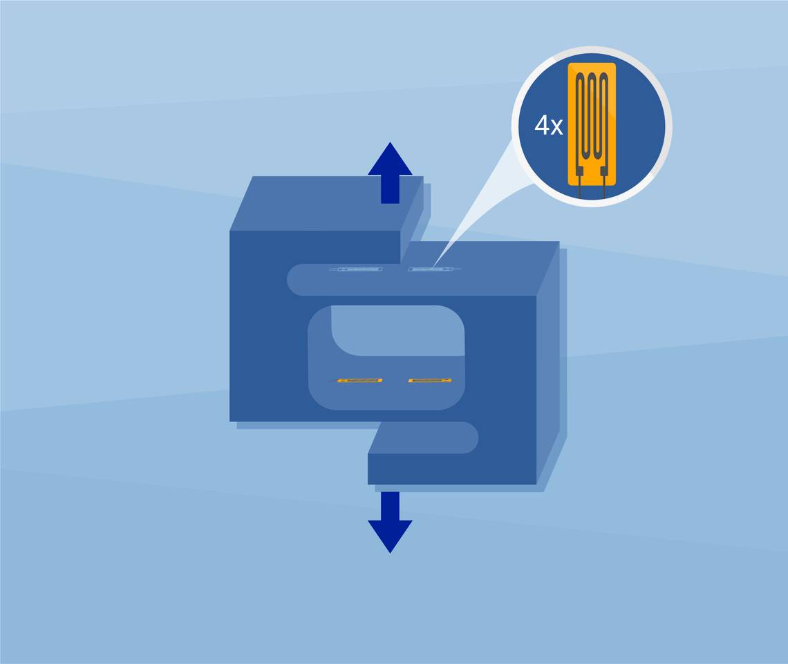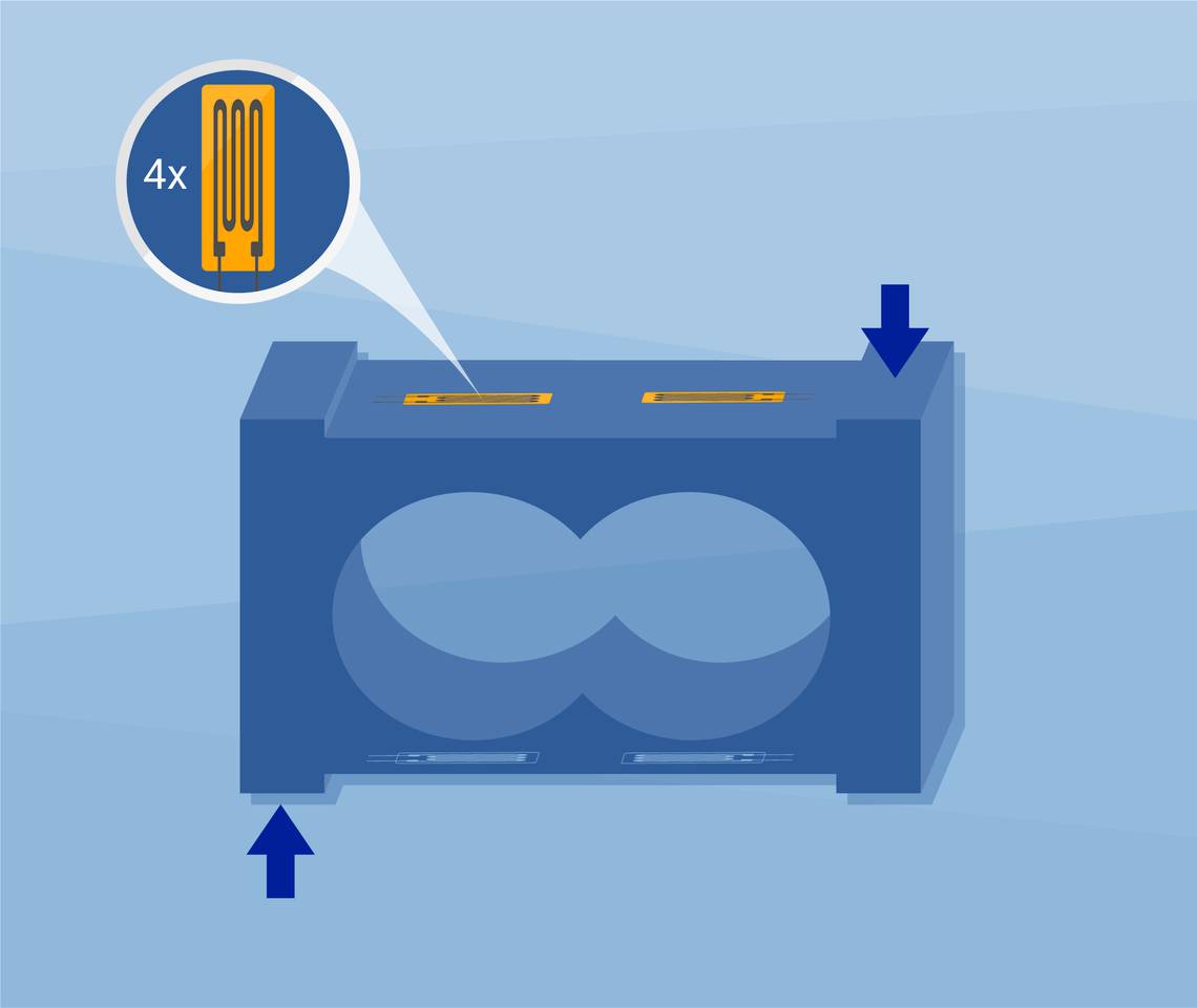 The strain gauges are firmly attached to the spring element, and therefore undergo the same movements it does. These strain gauges are arranged in what is called a bridge circuit, or more precisely a Wheatstone bridge circuit (see diagram). This means that four SGs are connected "in a ring" and the measuring grid of the force being measured is aligned accordingly.
