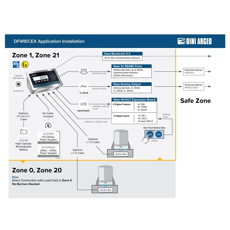 Dini Argeo S.r.l. (Italy) - The DFWIECEX weight indicator represents the state of the art for weighing in environments with a high risk of explosion. Thanks to the RGB backlit display, to the powerful processor and above all to the main interfaces available, all intrinsically safe, DFWIECEX allows the integration of weighing within production processes, directly in hazardous areas, driving solenoid valves and communicating with PLCs and other devices. IECEx and ATEX certified and approved for legal-for-trade use.